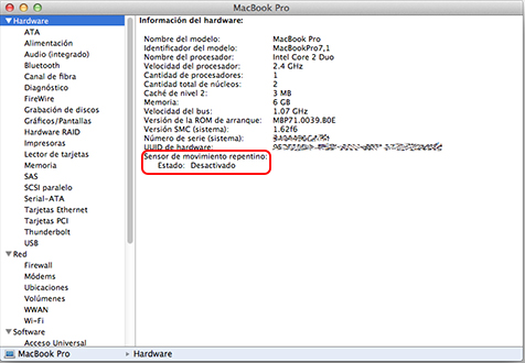 La característica se inhabilita a través de una línea de comandos, emitida por la utilidad Terminal. En este caso, hasta que se ejecute otra línea de comandos, el Sensor de movimientos bruscos permanece inactivo.